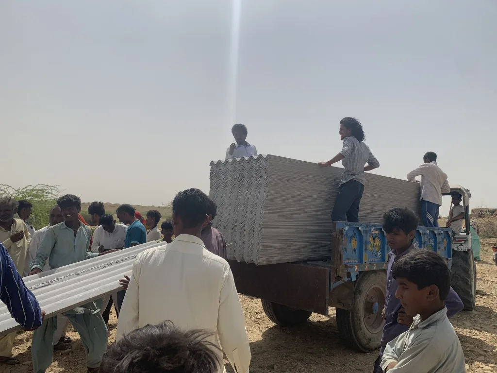 Seeing these families struggle in the scorching heat without a roof was painful. Therefore, we went to a cement sheet factory in Jaisalmer city and purchased good-quality sheets measuring more than 15 feet. After measuring a house, we bought 175 sheets and took them to Moolsagar.