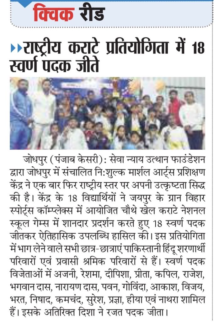 Eighteen students from Sewa Nyaya Utthan’s free martial arts training centre in Jodhpur won gold medals at the 4th Khel Karate National School Games, held on 24 – 25 January 2026 at Jaipur’s Gran Vihar Sports Complex. This marks the fourth consecutive national-level karate championship in which students from the centre have participated and won medals.