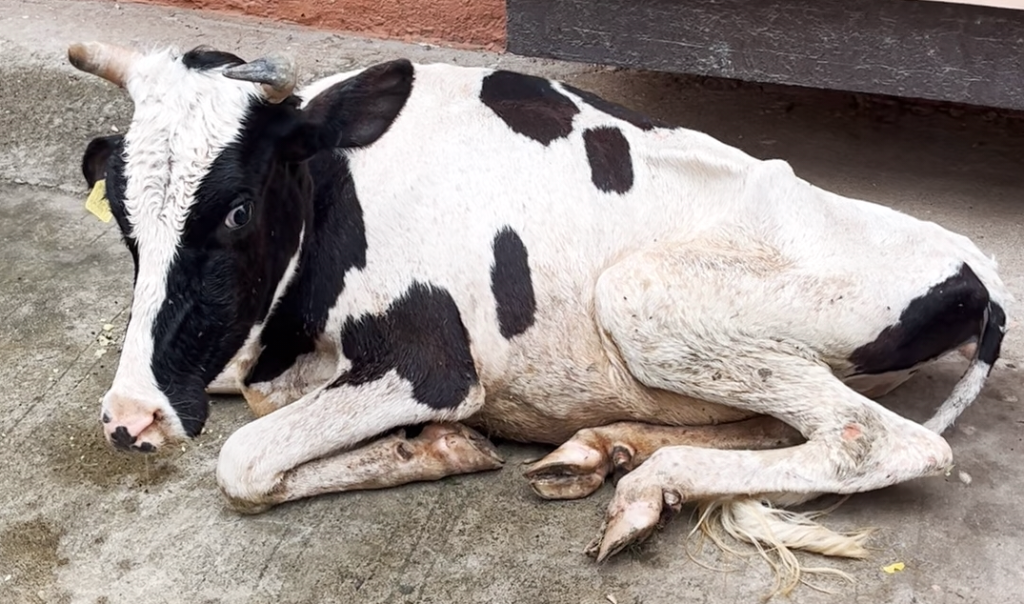 Our Gau Sewaks in Gujarat found this Gaumata sitting in an awkward manner. We were informed she was suffering from a nerve injury and weakness. After our treatment and care, she could walk normally.